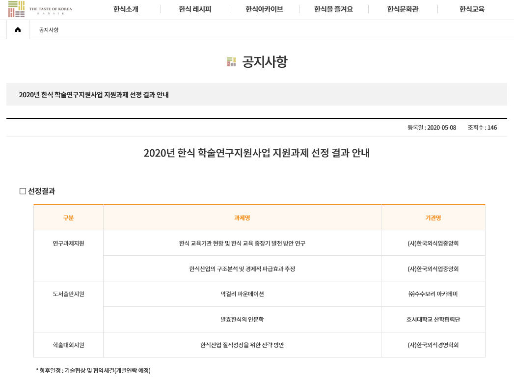 「2020년 한식 학술연구지원사업