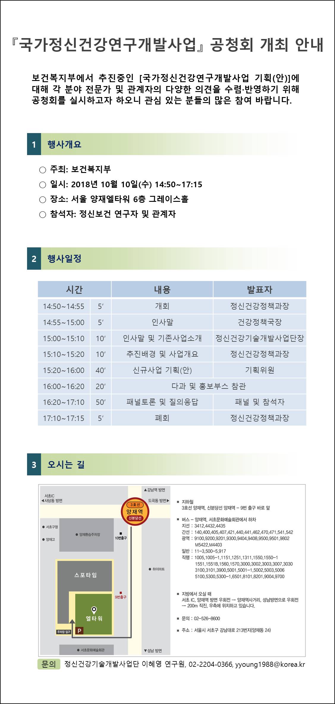 이에 귀 기관에 홍보를 요청드리오니, 붙임의 [국가정신건강연구개발사업 공청회 안내문]을 홈페이지 게시한국정신보건사회복지학회 회원분들께 메일 발송을
