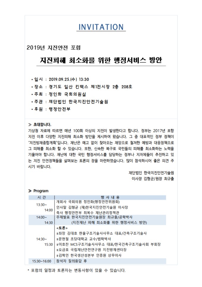 9월 25일 긴텍스 208호에서 '2019년 지진안전 포럼'을 아래와 같이 개최하오니 많은 참석 부탁드립니다.