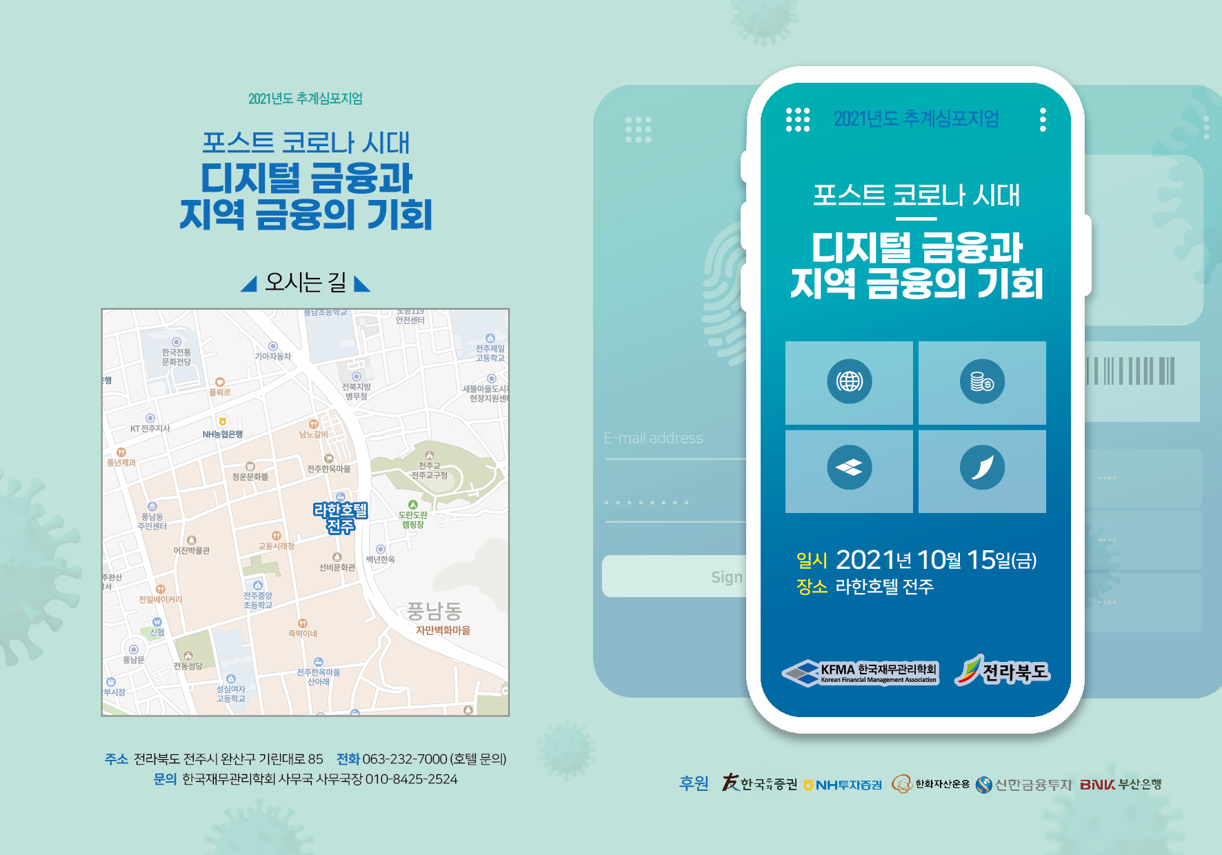 지난 안내에 공지한 바와 같이 다가오는 2021년 10월 15일(금), 전주에서 전북도청과 공동으로 “한국재무관리학회 추계 공동심포지엄”를 아래와 같이 개최됩니다.