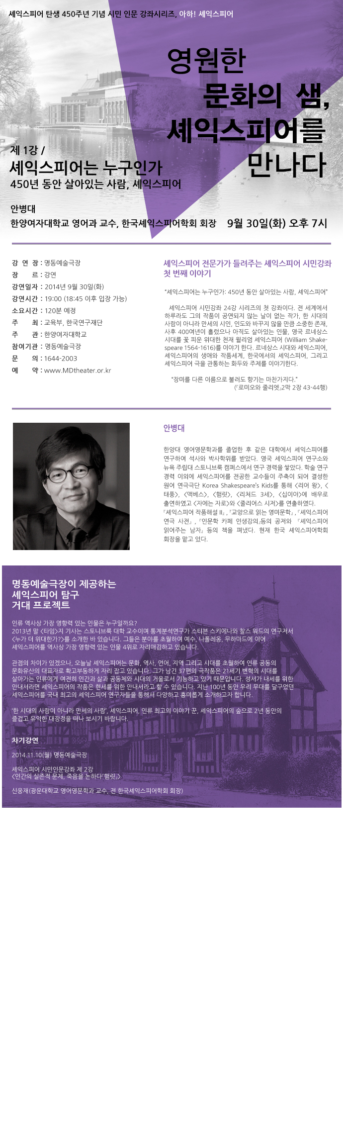 1년차는 시민들과 셰익스피어의 대표작품들을 함께 읽어가며 이해를 돕는 강좌, 2년차에는 셰익스피어를 차용한 미술, 음악 등 어려 예술적 재편들을 동해 문화 콘텐츠로서 셰익스피어의 가치를 시민들에게 전달하도록 기획하고 있습니다. 이번 인문강좌사업은 다가 올 또 다른 50년을 준비하여 학회는 학술연구는 물론, 공연, 미디어, 출판 및 교육 등에서 셰익스피어의 대중화를 통해 학회의 내실화 및 미래를 위한 새로운 도약을 추구하는 첫 발걸음이 될 것이니 모든 회원님의 관심과 지원을 다시 한 번 부탁드립니다. 그 첫 번째 강의가 이번 9월30일(화) 오후 7시 명동예술극장에서 “셰익스피어는 누구인가”의 주제로 진행됩니다. 명동예술극장은 약 300명 수용이 가능한 공간이므로 학회회원은 물론, 지도하시는 학생들 그리고 주변 분들에게 적극 홍보해 주시어 학회에서 진행하는 본 강좌들이 성황리에 치러질 수 있도록 협조를 부탁드립니다.