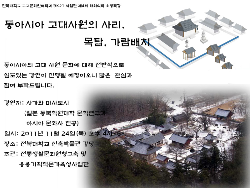 안녕하십니까? 전북대학교 고고문화인류학과 BK21사업단에서는 해외석학이신 사가와 마사토시(佐川 正敏)선생님을 모시고 초청강연을 개최합니다. 많은 관심있는 선생님들의 참여 부탁드립니다.