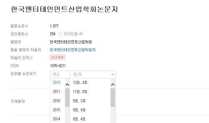 한국엔터테인먼트산업학회논문지 " 논문 발행 현황"