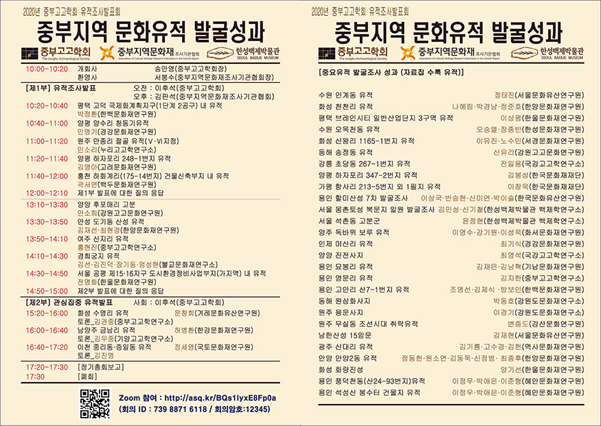 COVID-19로 인하여 2020년 중부고고학회 유적조사발표회는 비대면 온라인회의(ZOOM)으로 진행합니다.