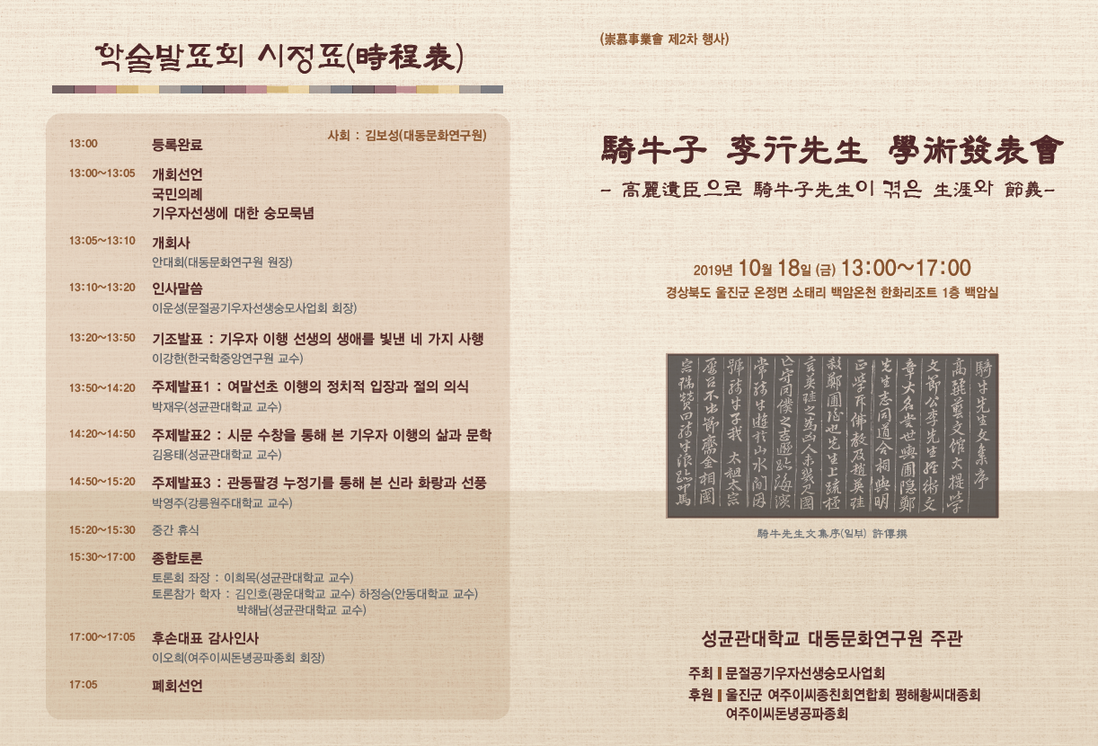 성균관대학교 대동문화연구원에서는 ‘고려의 유신(遺臣)’ 기우자(騎牛子) 이행(李行) 선생이 남긴 발자취와 절의(節義)를 재조명하는 학술발표회를 개최합니다. 문절공기우자선생숭모사업회의 노력으로 경상북도 울진군 월송정에 ‘기우자의 길’이 상정되고 기우설비가 세워진 일을 기념하는 자리이기도 합니다. 이 뜻깊은 행사 뒤에 전문가의 학술 논의가 활발하게 이어지기를 기대합니다.