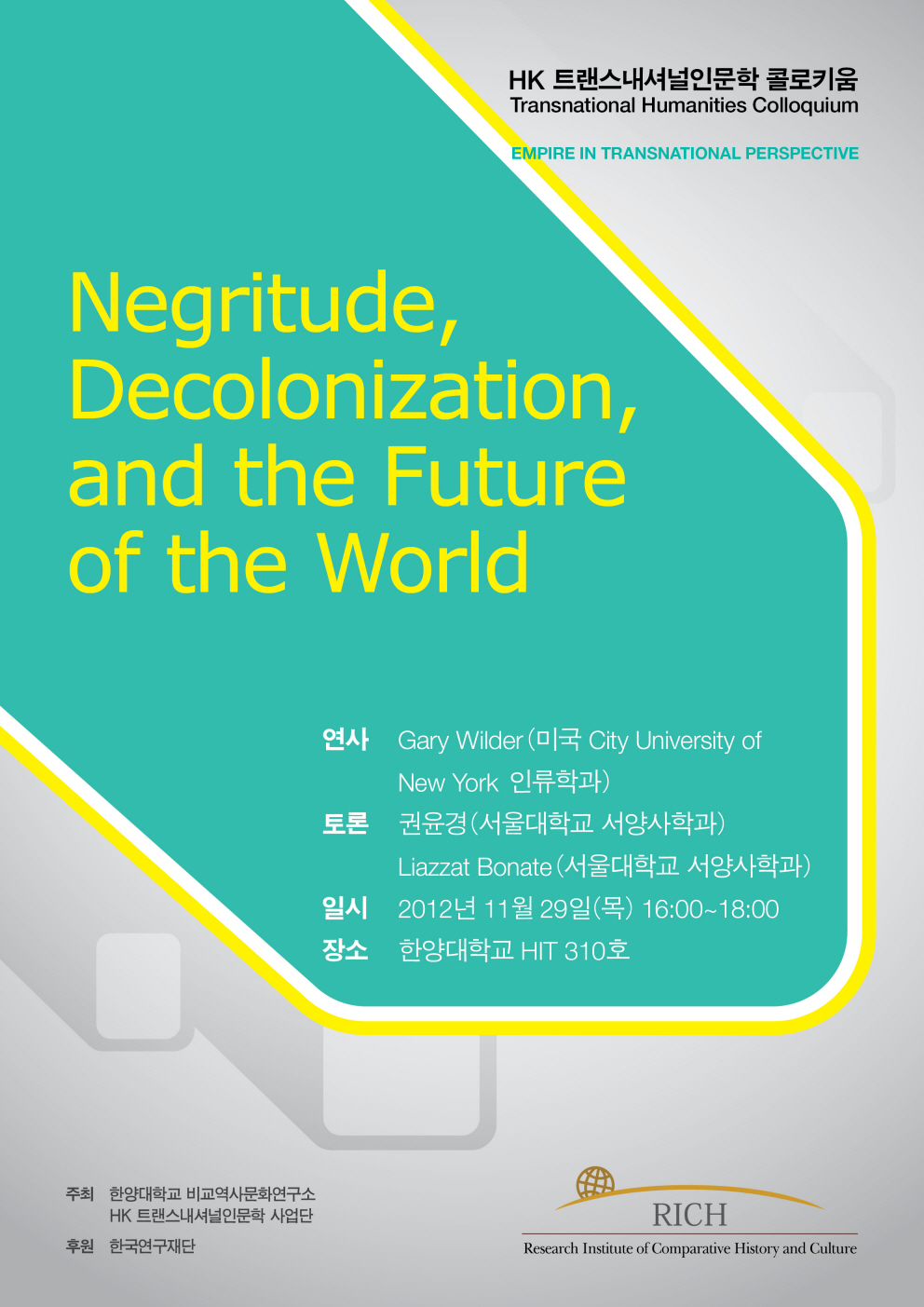 오는 11월 29일 강좌의 연사는 프랑스 제국, 서아프리카 및 안틸제도와 유럽을 중심으로 식민국가, 역사인류학, 사회/정치이론에서 흥미로운 연구성과를 생산해온 미국 City University of New York 인류학과의 Gary Wilder 교수입니다. 강좌 제목은 'Negritude, Decolonization, and the Future of the World'이며, 토론자로는 서울대학교 서양사학과 권윤경 박사와 Liazzat J.K. Bonate 교수께서 참여하십니다.