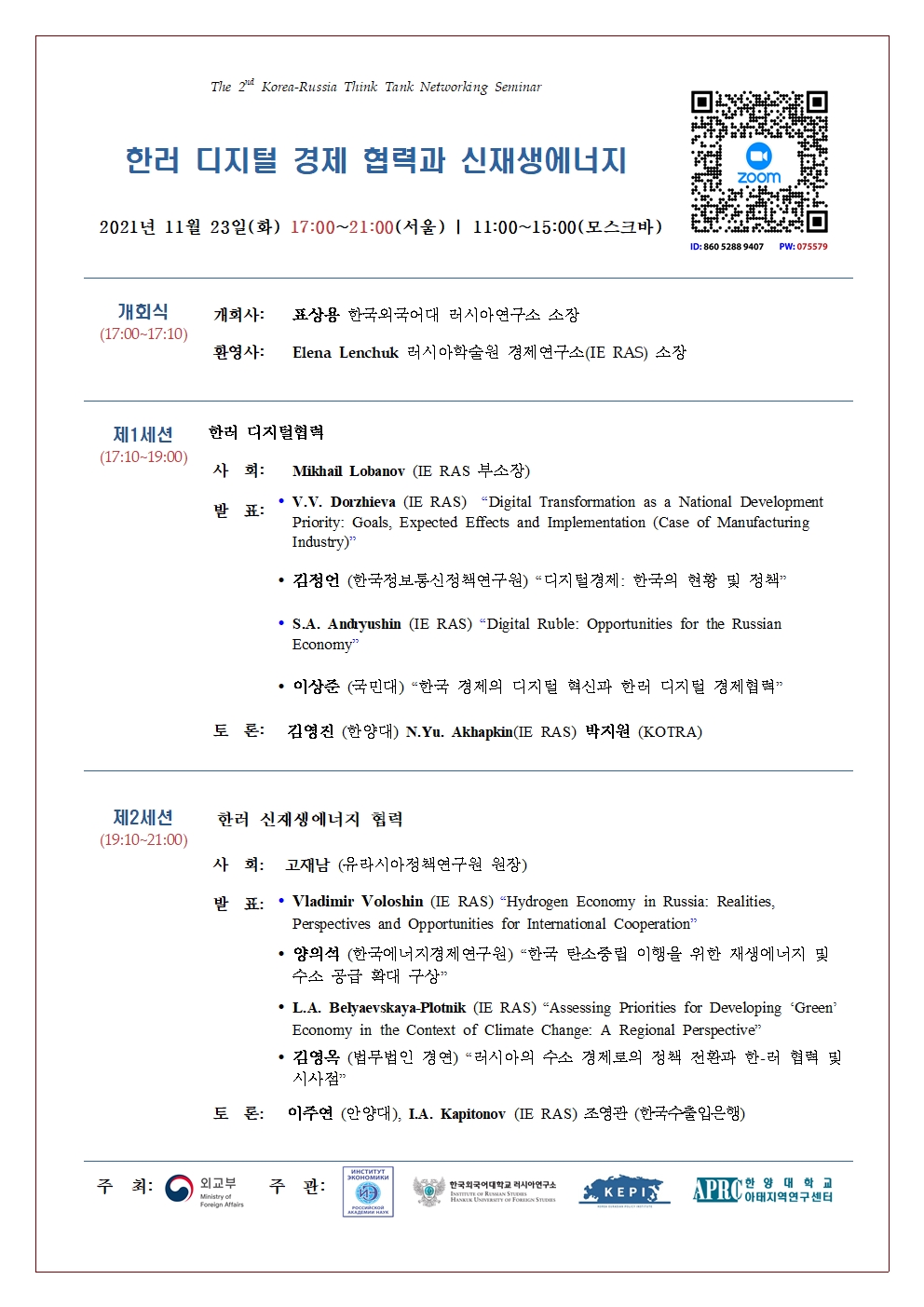 그 두번째 행사로 러시아 학술원 산하 경제연구소(IE RAS)와 공동으로 '한러 디지털 경제 협력과 신재생에너지' 라는 주제로 다음과 같이 세미나를 개최하오니 많은 관심과 참여 부탁드립니다.
