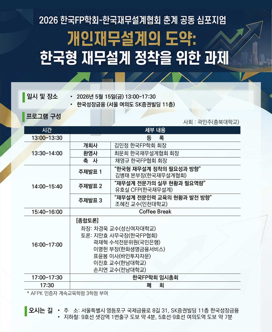 이에 이번 춘계 심포지엄에서는 학계와 산업계의 전문가들을 모시고, 국내 개인재무설계의 현주소를 진단하고