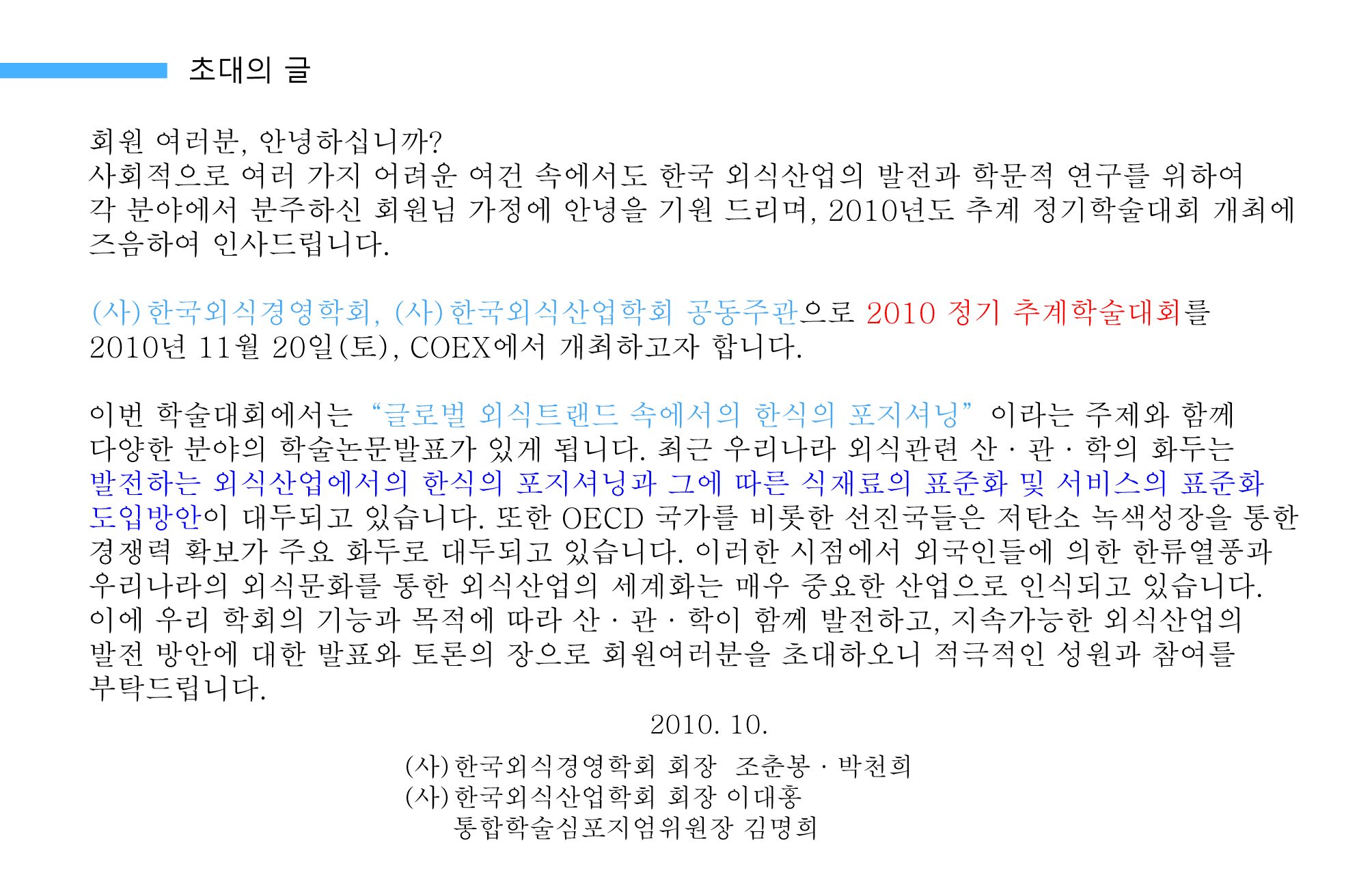 2010 추계 외식관련학회통합 국제학술세미나 개최 안내