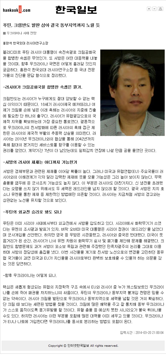 [언론보도][기고/홍완석] 푸틴, 크림반도 발판 삼아 결국 동부지역까지 노릴 듯 한국일보 2014.03.20