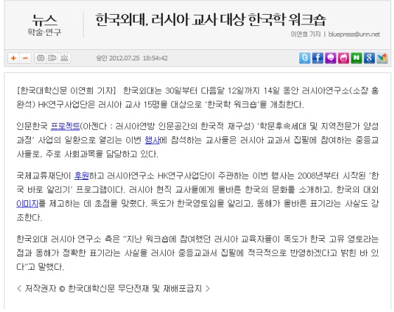 [언론보도]한국외대,러시아 교사 대상 한국학 워크샵-한국대학신문(2012.07.25)