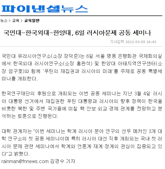 [언론보도]국민대-한국외대-한양대, 6일 러시아문제 공동 세미나-파이낸셜뉴스(2012.3.6)