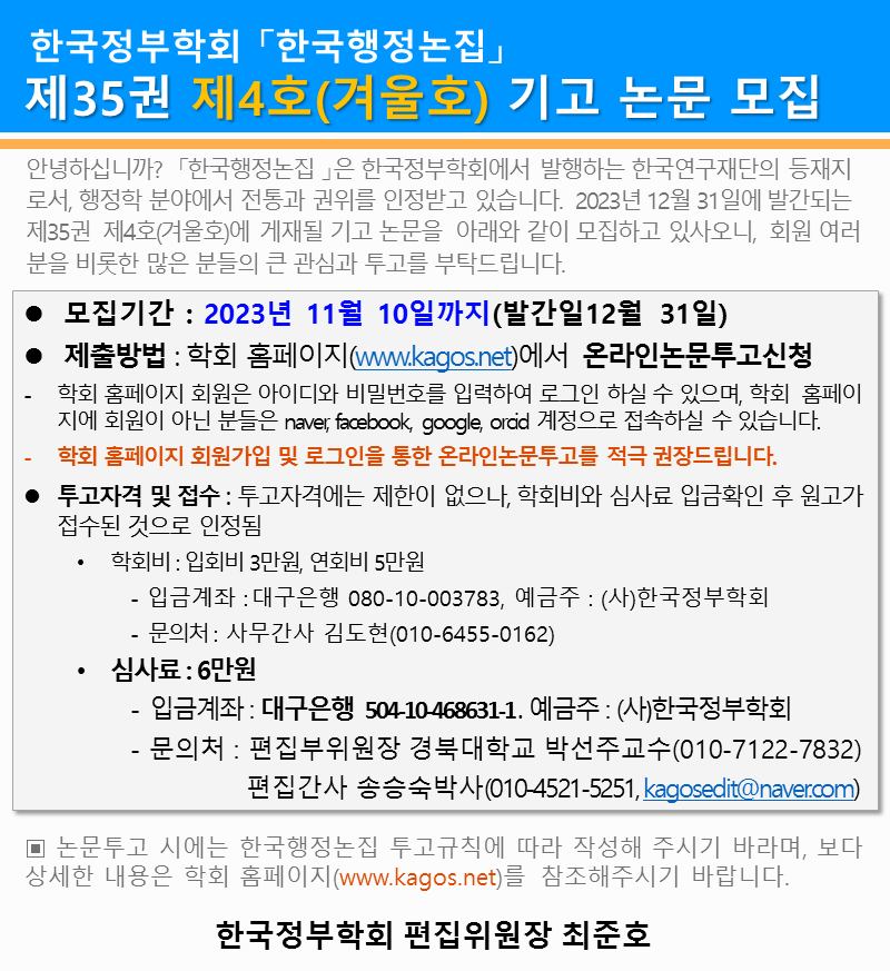한국행정논집 35권 3호 논문기고 안내- 기간연장
