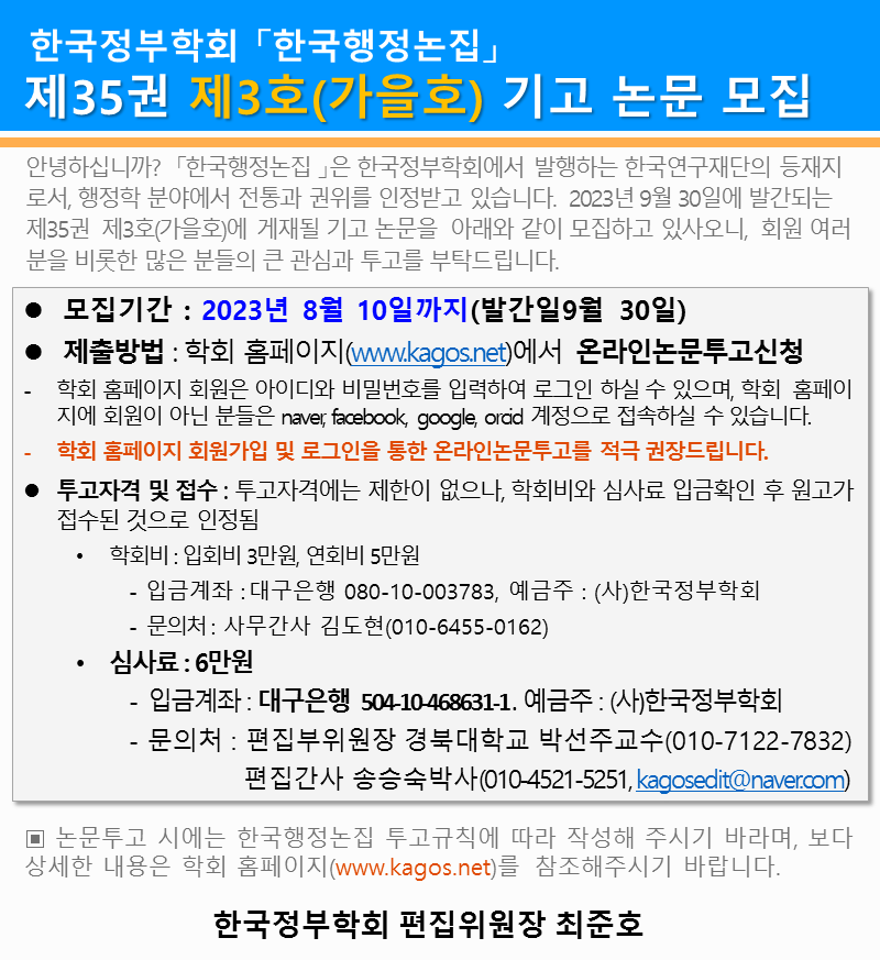 한국행정논집 35권 3호 논문기고 안내- 기간연장