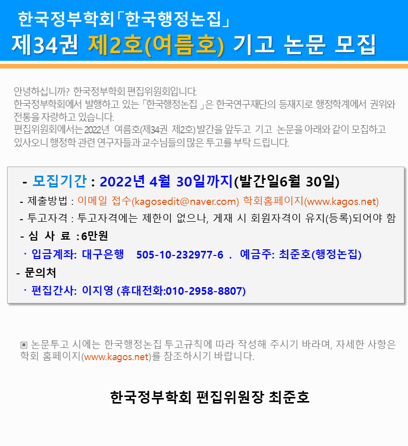 한국행정논집 34권 1호 논문기고 안내-기간연장-