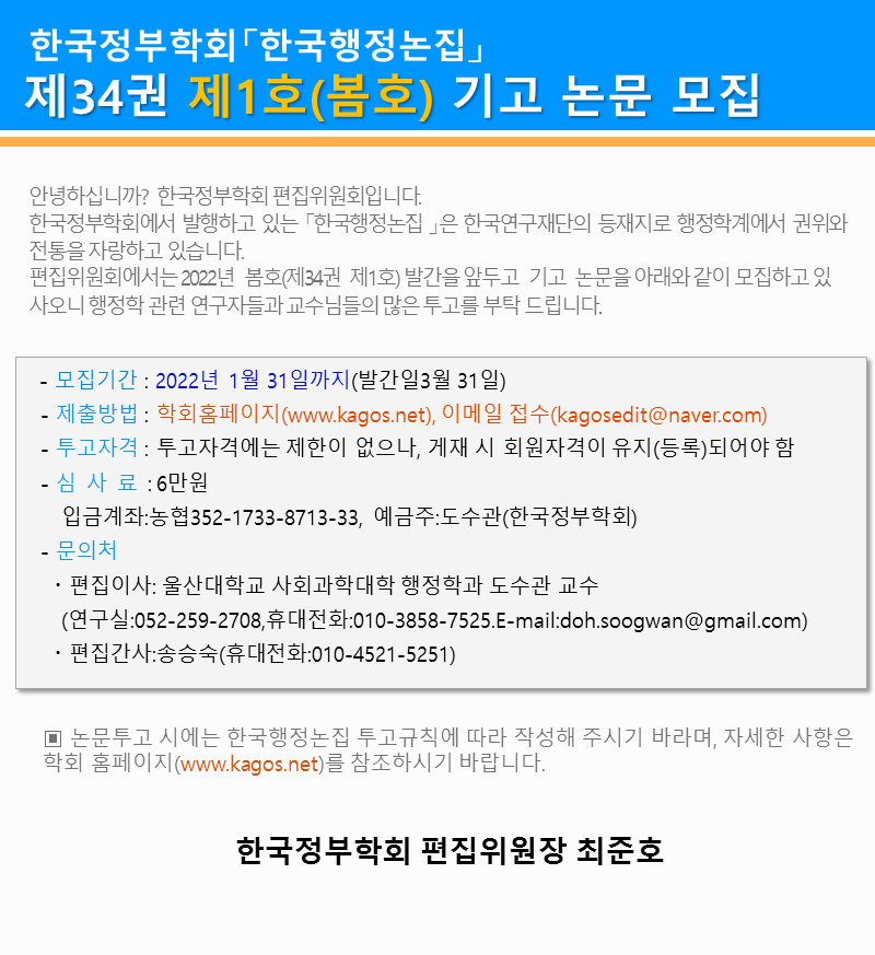 한국행정논집 34권 1호 논문기고 안내-기간연장-