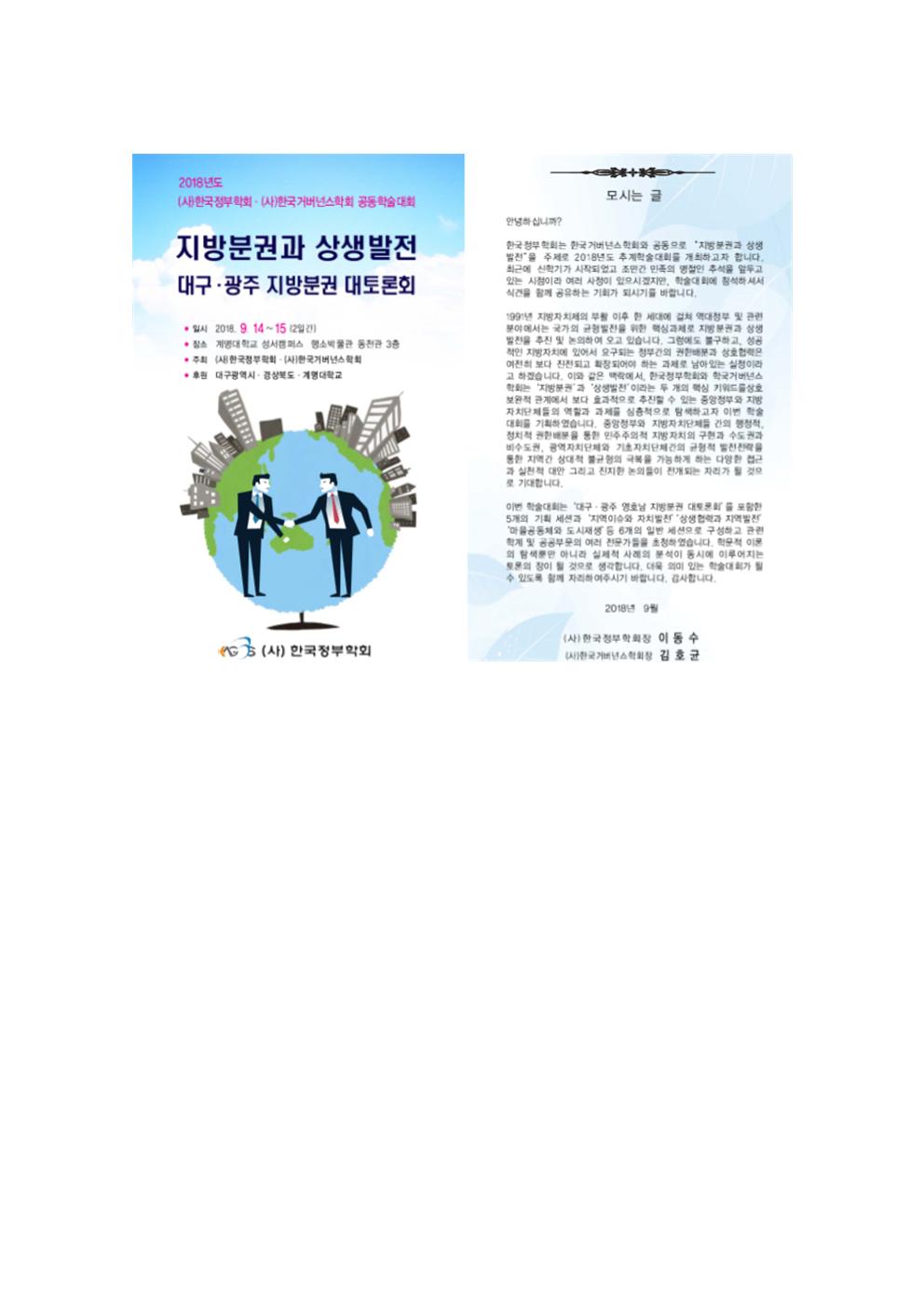 한국정부학회는 한국거버넌스학회와 공동으로 “지방분권과 상생발전”이라는 주제로 2018년도 추계학술대회를 개최하고자 합니다. 최근에 신학기가 시작되었고 조만간 민족의 명절인 추석을 앞두고 있는 시점이라 여러 사정이 있으시겠지만, 학술대회에 참석하셔서 식견을 함께 공유하는 기회가 되시기를 바랍니다.