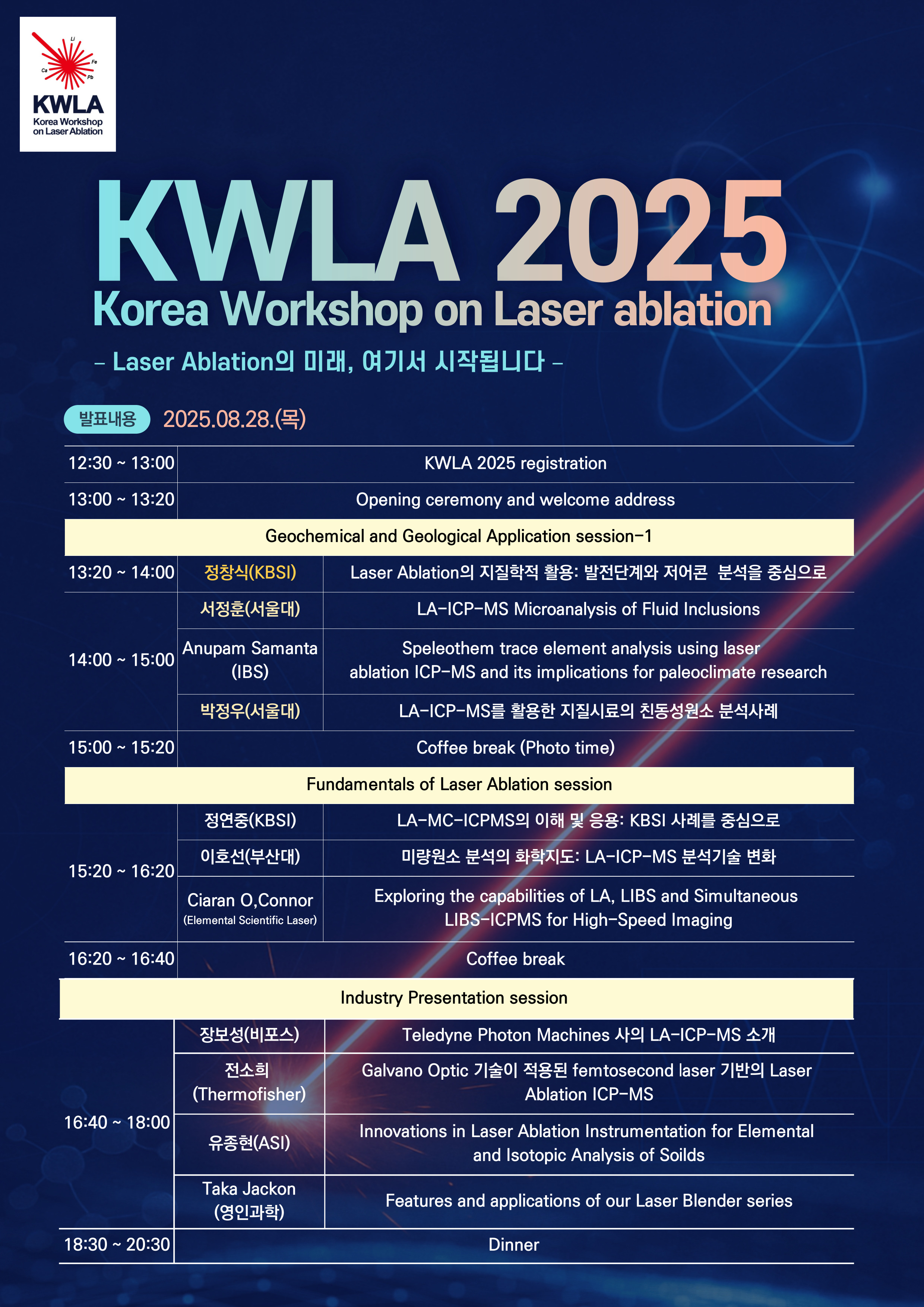 오는 8월 28일-29일 양일간, KWLA 2025 (Korea Workshop on Laser Ablation)가 한국기초과학지원연구원 오창바이오 환경연구소에서 개최됩니다.